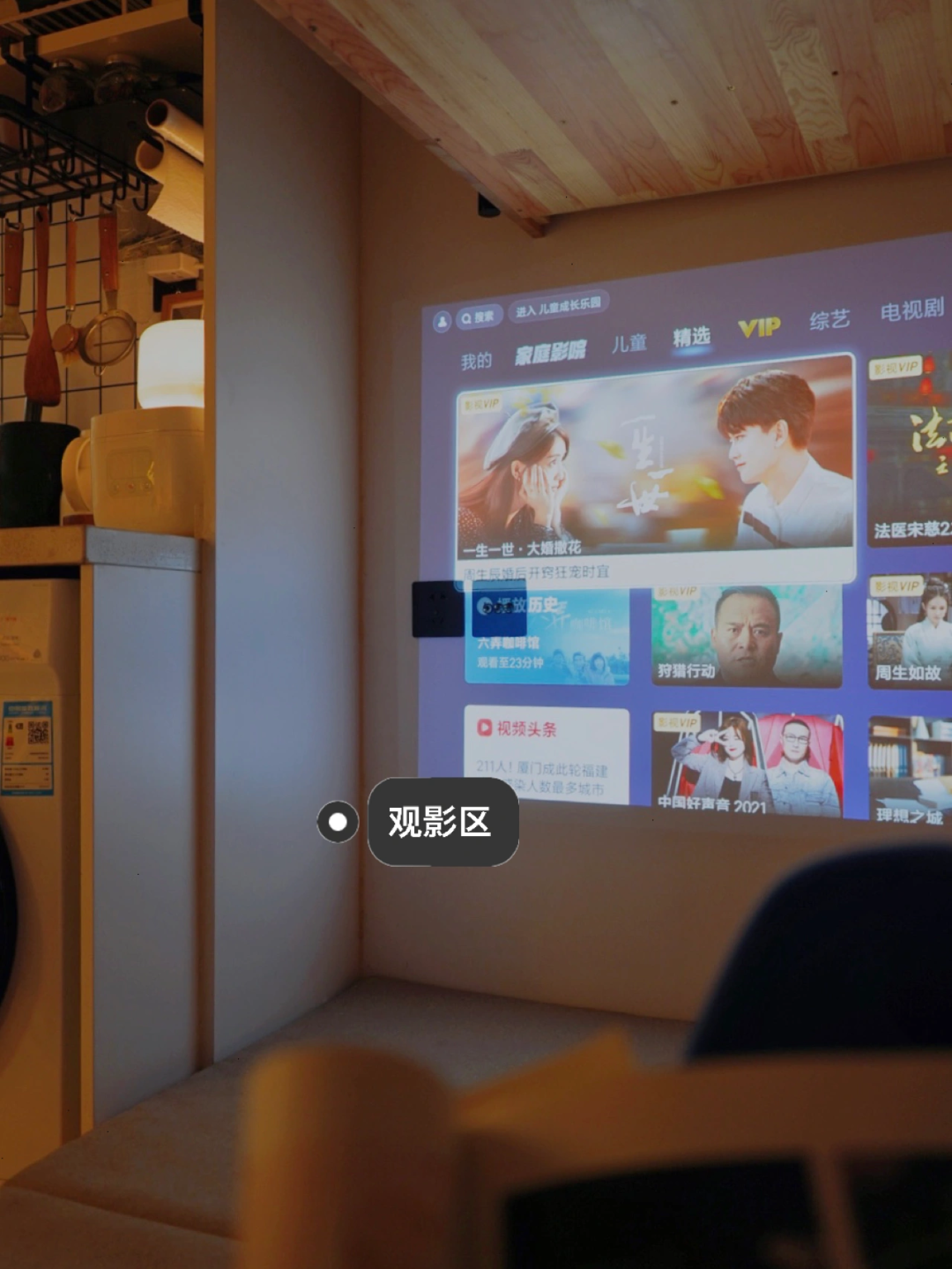 厨房一侧被打造成榻榻米休闲区,可以休息和观影。