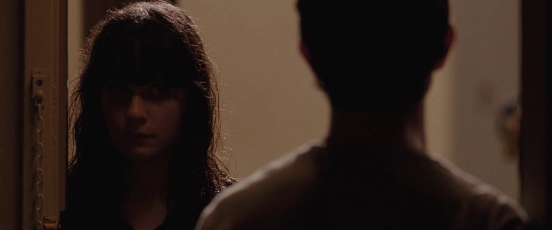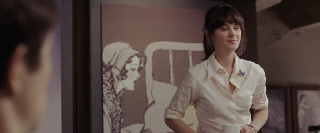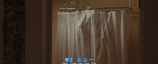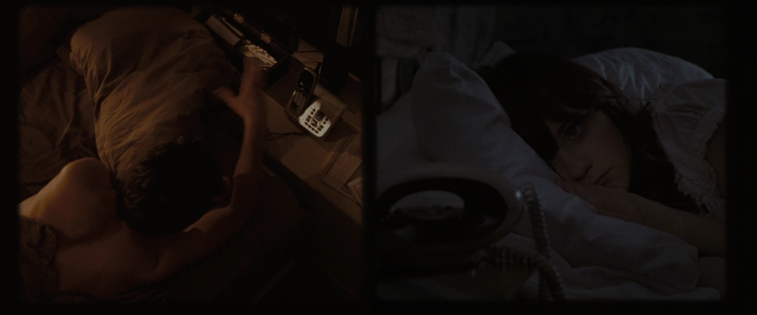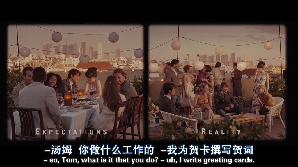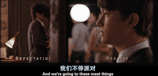 现实则是两人分处画面左右两侧,中间的客人加入了他们的对话,两人显得疏远。