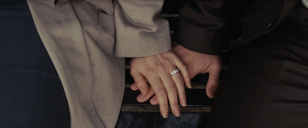 公园里,长椅上,并肩而坐的男女,手手相覆,无名指点缀着幸福的光。