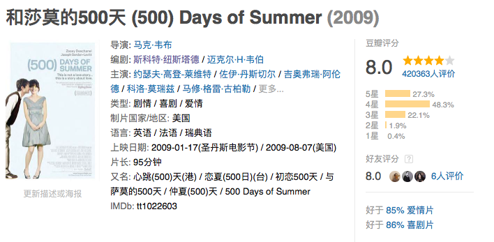 如果真是如此,《和莎莫的500天》也不会经受得住42w人的打分后,在豆瓣依然能保持8分佳绩。