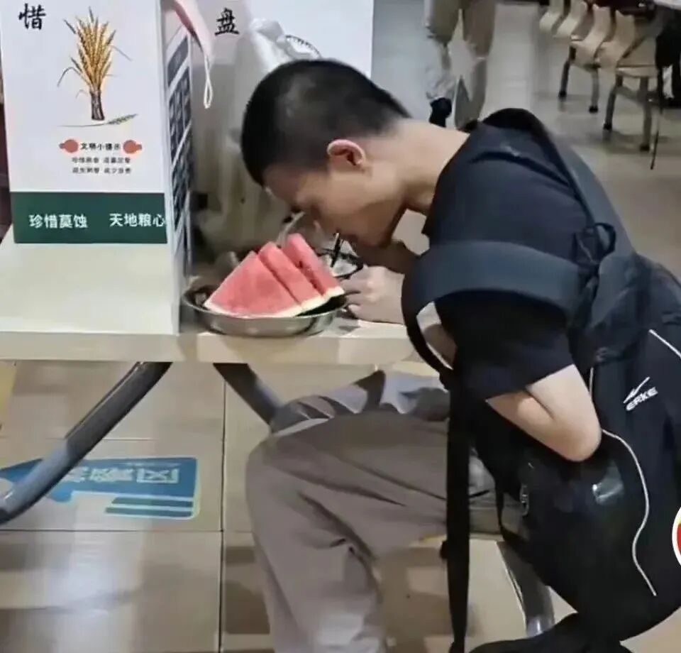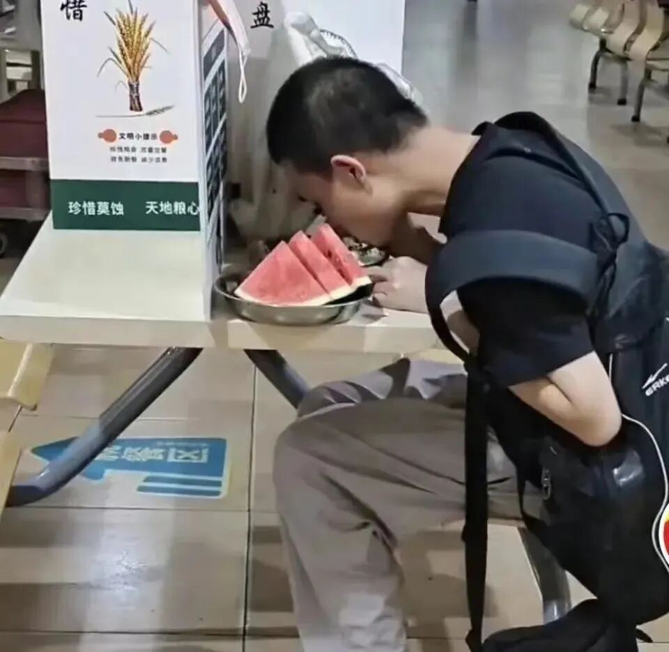 只见“韦神”穿着朴素,坐在狭小的位置里专心干饭,丝毫未察觉周围人的目光。