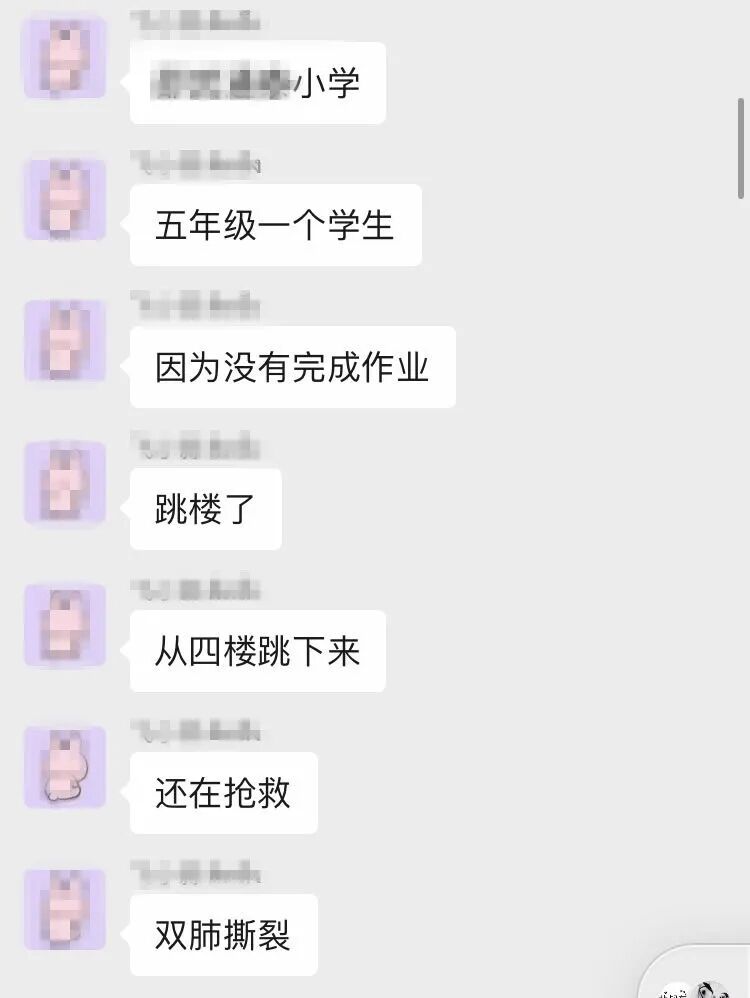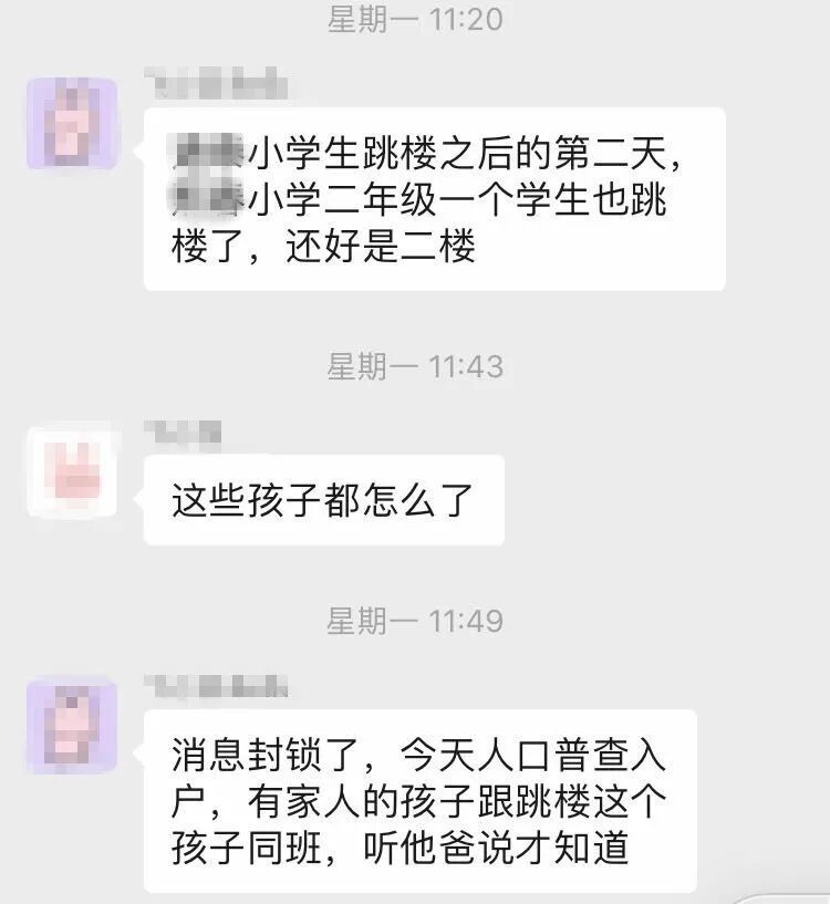 10月10日,某小学一名二年级学生轻生,从二楼跳下,由于消息被封锁,健康状况不得而知。