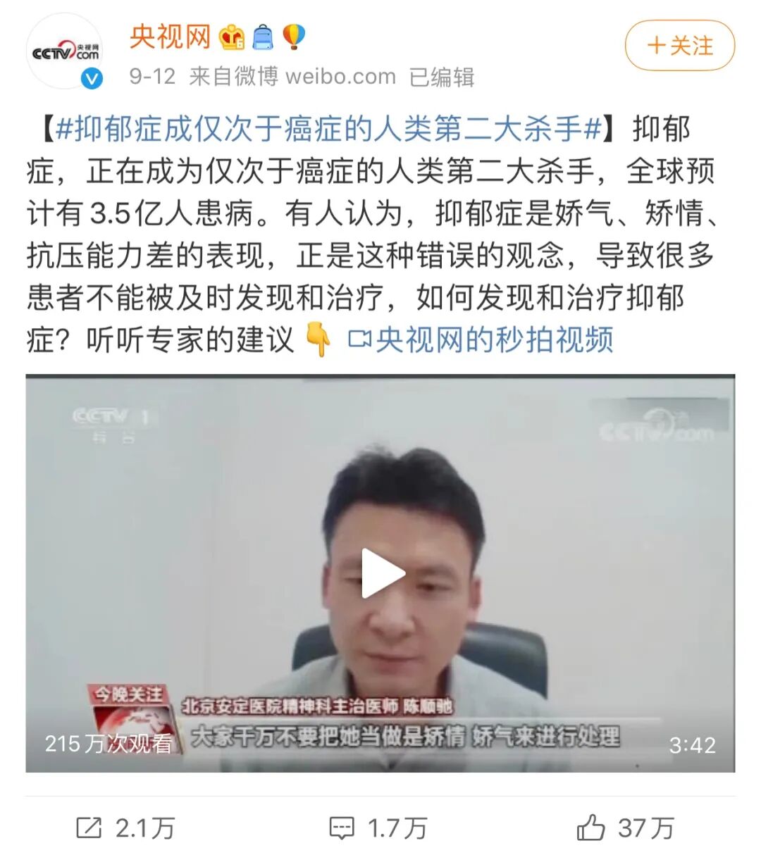 央视网的这则新闻还表示,很多人认为,抑郁症是娇气、矫情、抗压能力差的表现,正是这种错误观念,导致很多患者不能被及时发现和治疗,最终酿成悲剧。