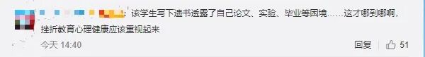 “该学生写下遗书透露了自己论文、实验、毕业等困境.......这才哪到哪啊,挫折教育心理健康应该重视起来。”