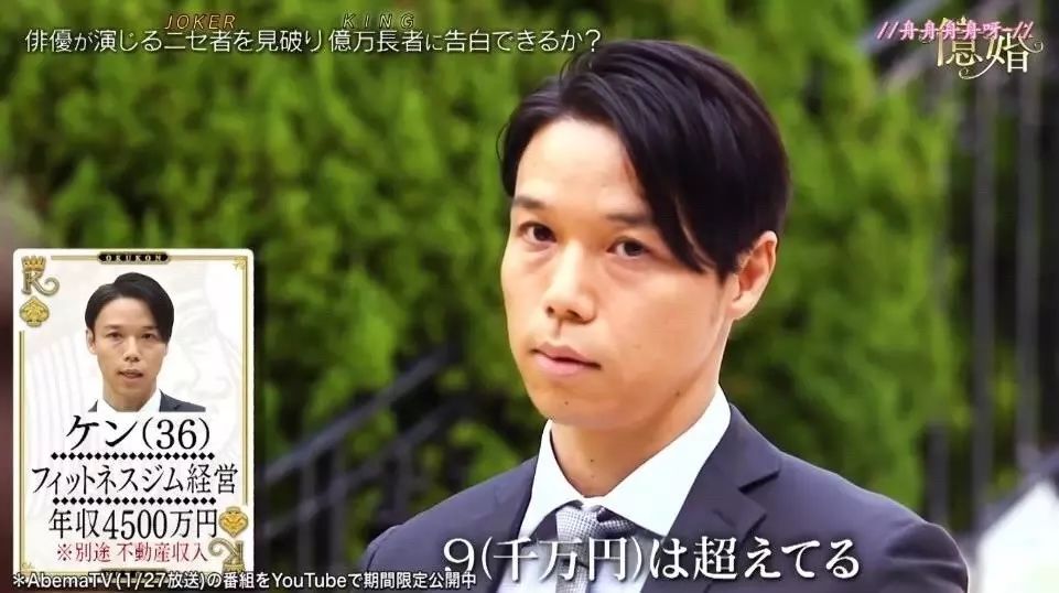 还有一位2号男嘉宾,自称是健身房老板,36岁,年收入4500万日元(270万人民币),同时还有不动产收入,外形看上去也很有富豪相。
