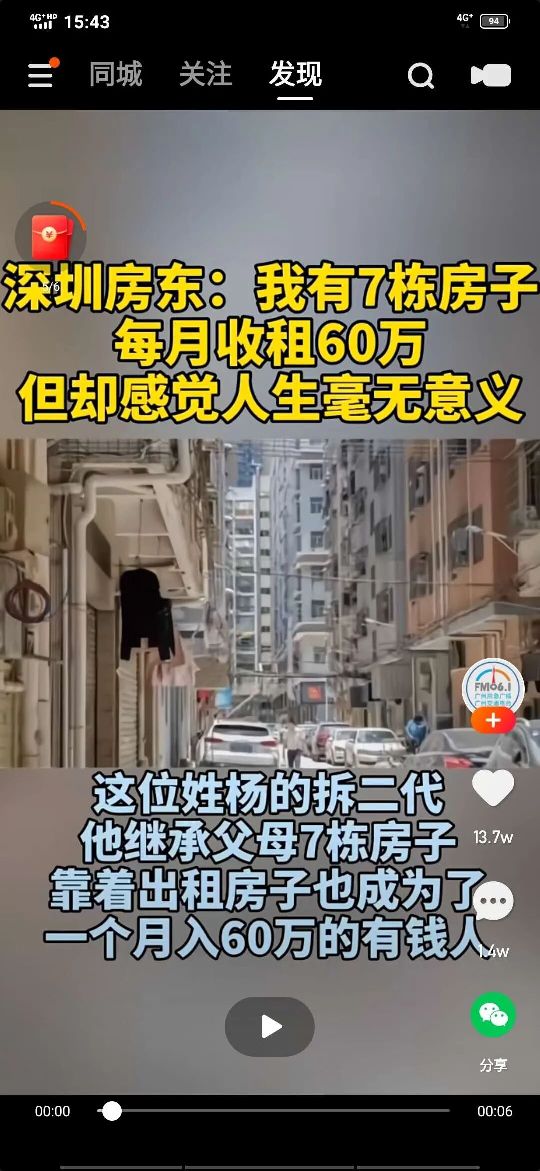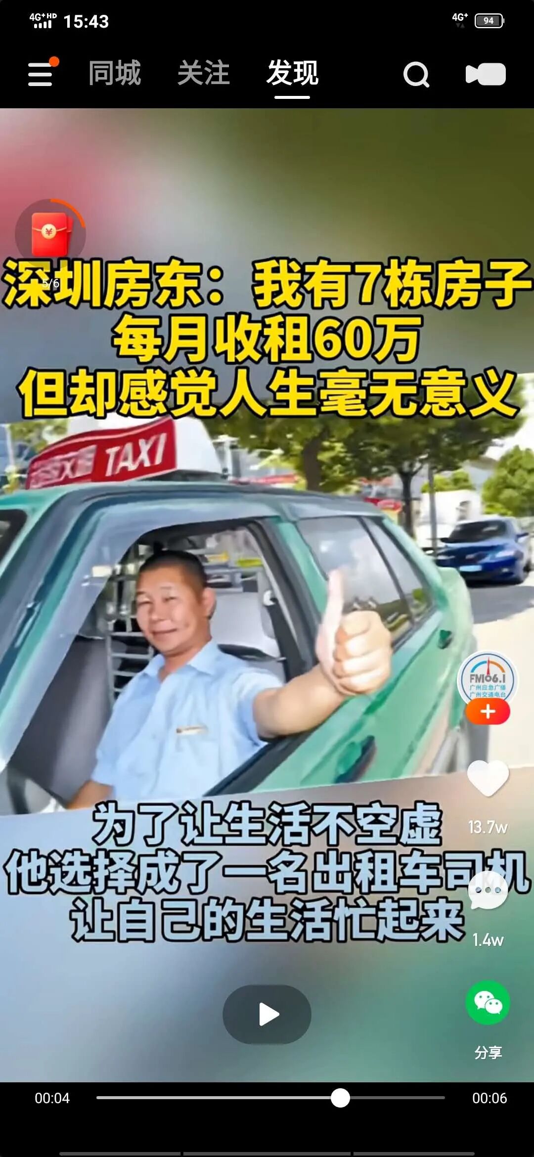 快手上有一个短视频,视频中的主角杨先生表示,自己在深圳有7栋房子,每月收的租金可达60万,但他却觉得人生毫无意义。