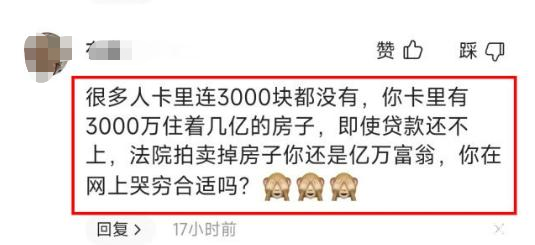 存款3000万的富人向存款不到3000的人哭穷,也难怪网友会在评论中义愤填膺:“法院拍卖掉房子你还是亿万富翁,你在网上哭穷合适吗?”