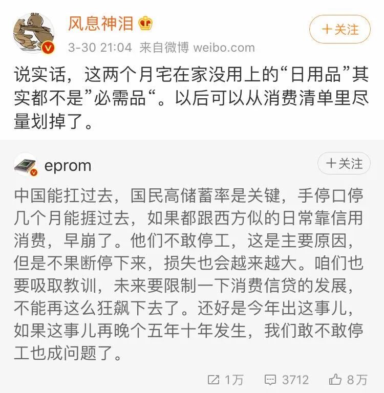 一位大V转发了eprom的微博,说:这两个月宅在家没用上的“日用品”其实都不是“必需品”。以后可以从消费清单里尽量划掉了。