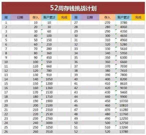 比如第一周存10元,第二周存20元,第三周存30元……以此类推,第52周存520元。