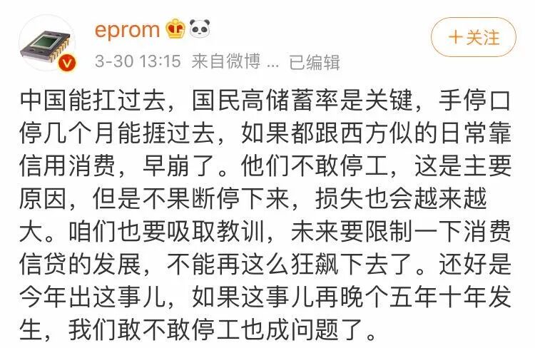 前几天,知名科学博主eprom说,中国能扛过这次疫情,很重要的一个原因是,大多数中国人有存钱的观念,即使暂时停工一段时间,也能勉强撑过去。