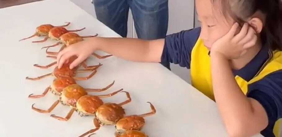 还有螃蟹,在她的捣鼓下,变成了令人头皮发麻的蜈蚣……