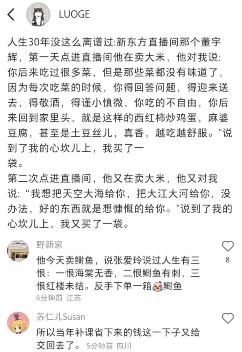 新东方的“文化带货”直接拉高了直播界的天花板,这会让直播行业进入良性循环,不再是简单粗暴歇斯底里地“买买买”,而是让观众边看直播边享受心灵的洗礼。