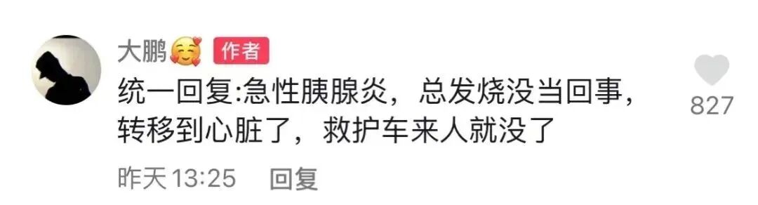 紧接着,他的好友大鹏回应:他是因为急性胰腺炎走的,之前总发烧没当回事,结果转移到了心脏。救护车来的时候,人就已经没了。