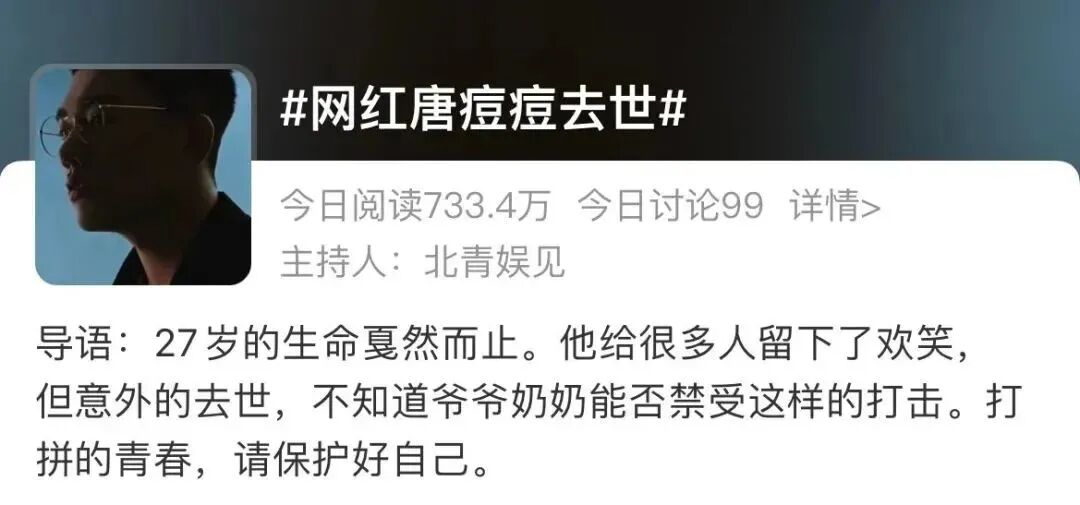 前段时间,在网上看到一条噩耗:天津网红“唐痘痘”突发疾病去世,年仅27岁。
