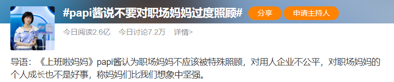 但papi酱却认为,无论是从企业,还是女员工本身来说,因为一个女员工生了孩子而对她特殊照顾的行为,并不值得提倡。