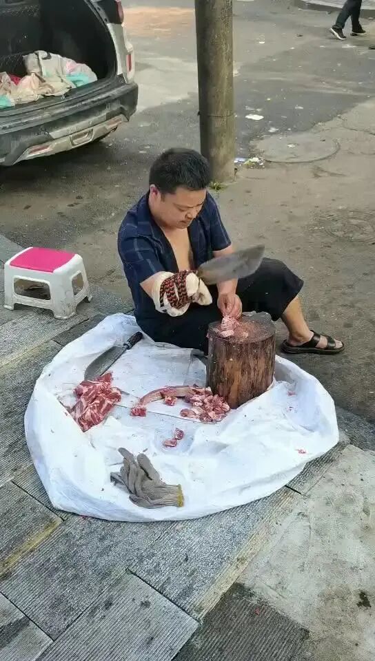 视频中,只见失去右臂的小哥,将菜刀绑在断臂处剁肉,左手扯下一个塑料袋,用嘴咬开塑料袋口,再用左手将砍下的排骨麻利地装进袋子,称重……