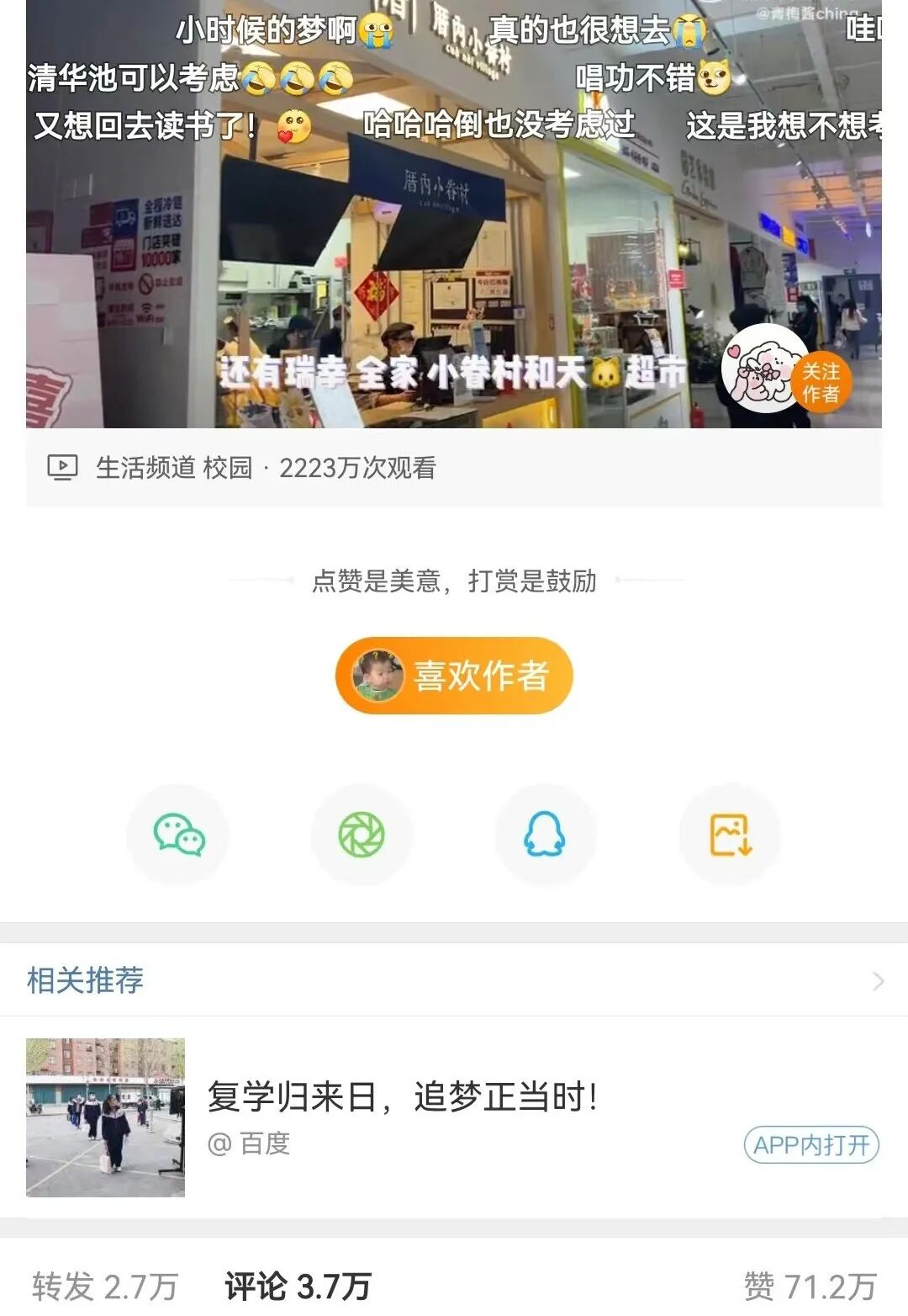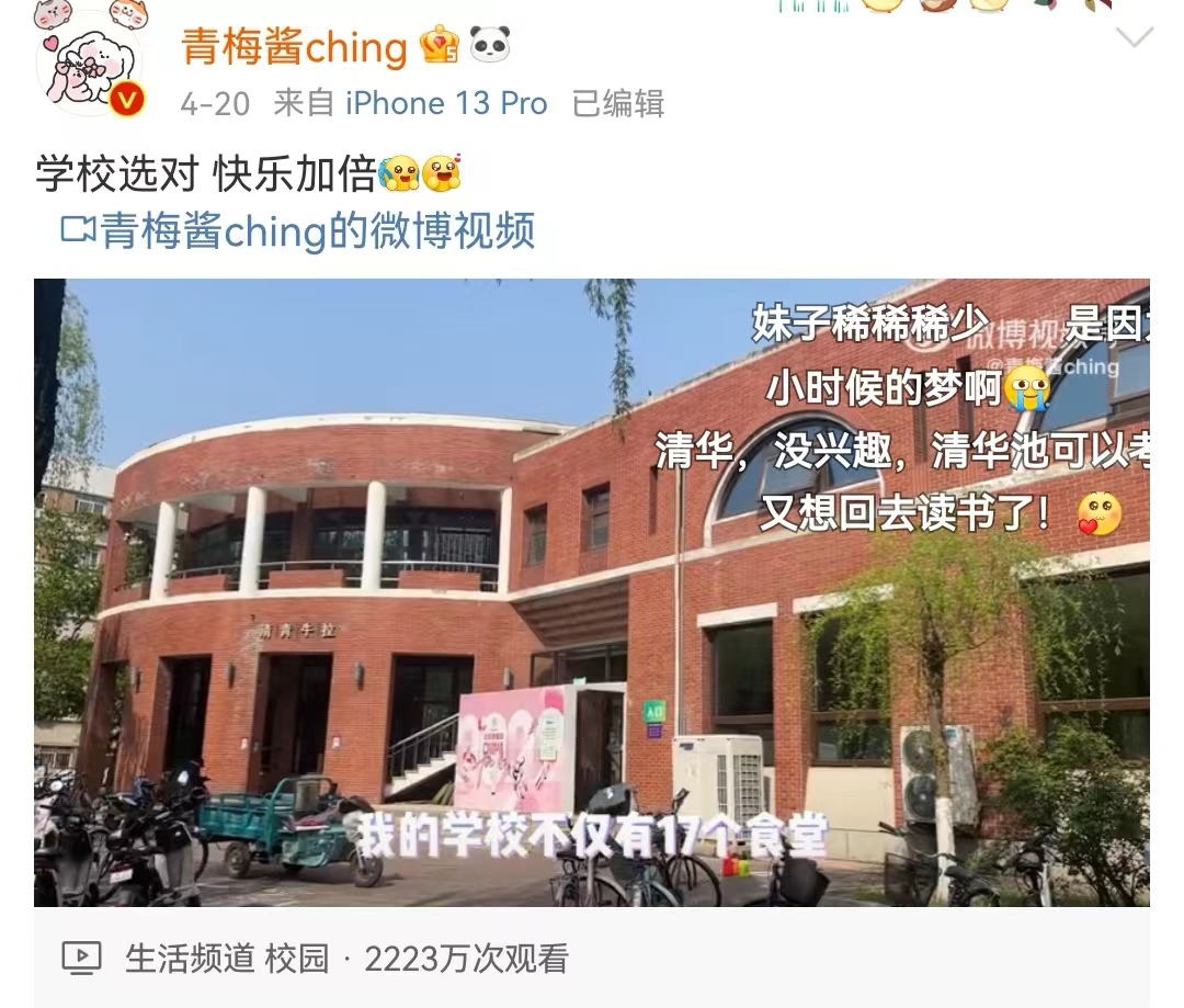 起因是一个叫@青梅酱ching的美食博主,清华大学的在读学生,在微博上发了一个关于自己校园的视频,配文:学校选对,快乐加倍。
