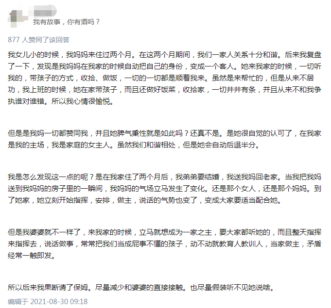 知乎上一个答主分享了自己和妈妈、婆婆同住一段时候后的感受,并从中找到了破解婆媳矛盾的关键。