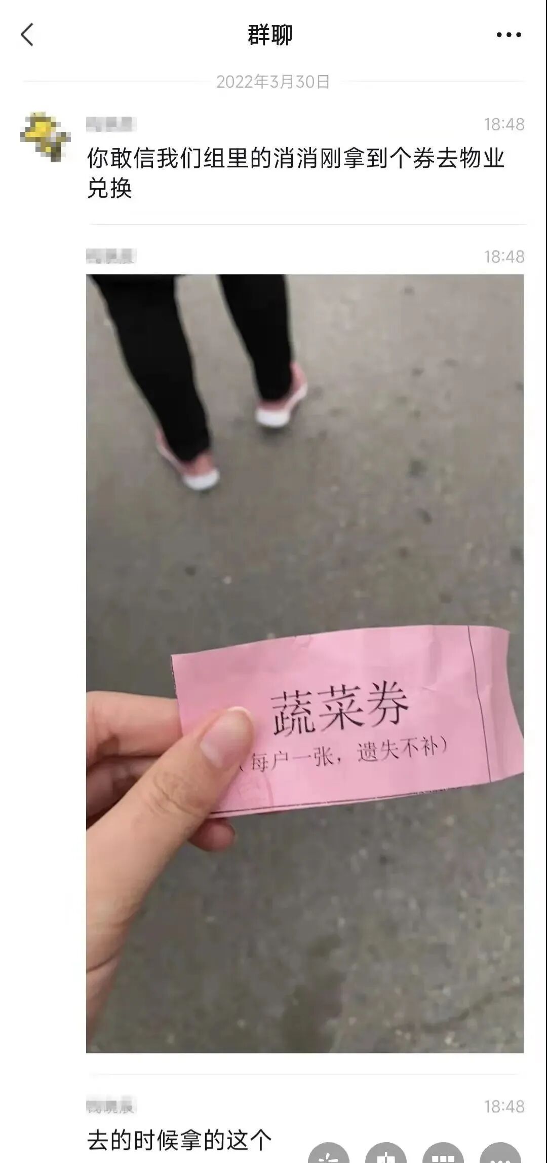网上流传着上海某微信群的一段聊天记录,上海某小区的业主,买菜须手持“蔬菜券”。