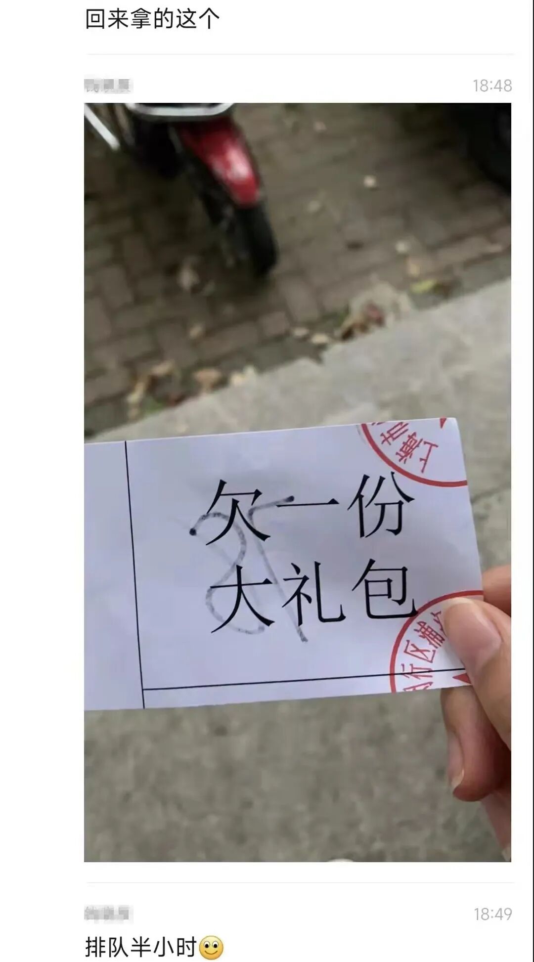 而即便如此,排了半小时队之后还是什么也没能买到,最后又收到物业回的字条“欠一份大礼包”。
