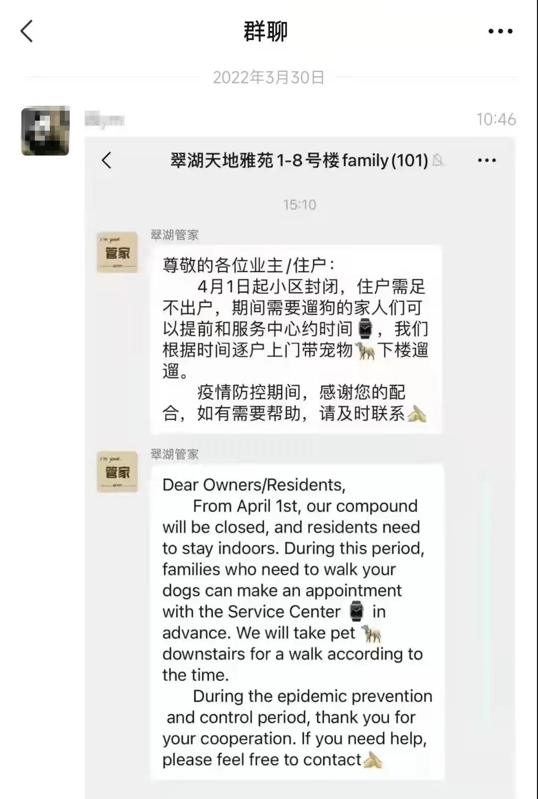 疫情防控期间,上海高档小区翠湖天地的物业,在业主群里表示,可以为业主遛宠物狗。