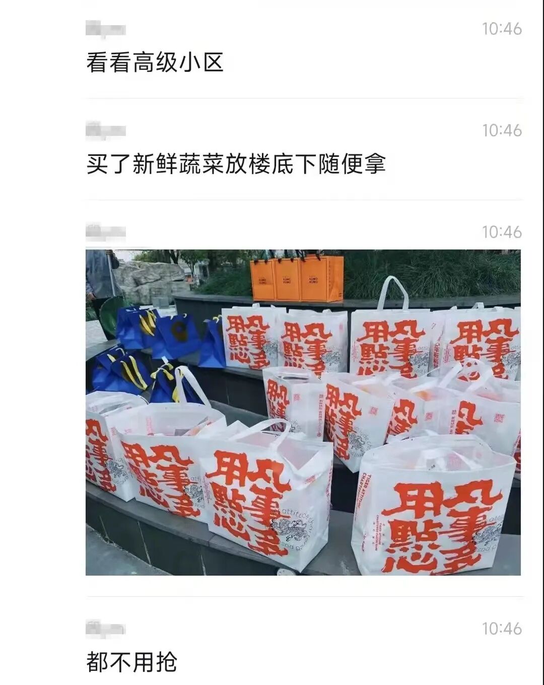 物业早早为他们准备好了新鲜蔬菜放在楼下: