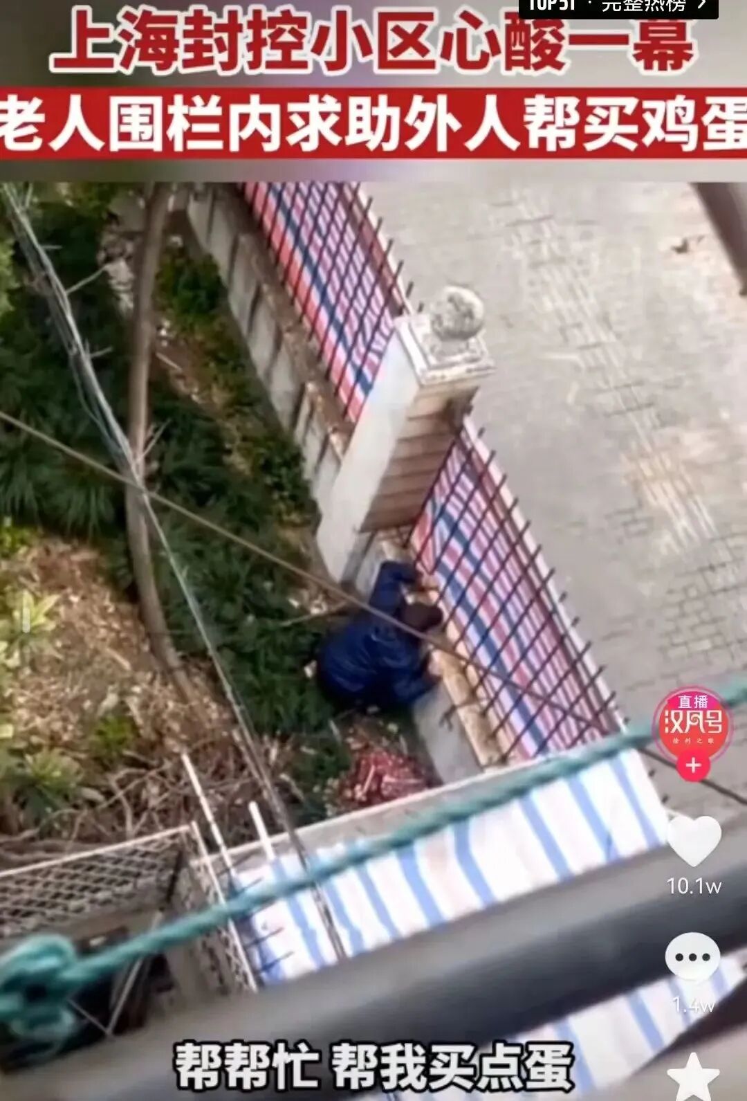 上海另一个被封控的小区里,老大爷蹲在围栏内,扒拉开围在围栏上的简易布帘,扯着嗓子朝外面的行人喊话求助,希望有人能帮他买点鸡蛋,场面无比心酸。