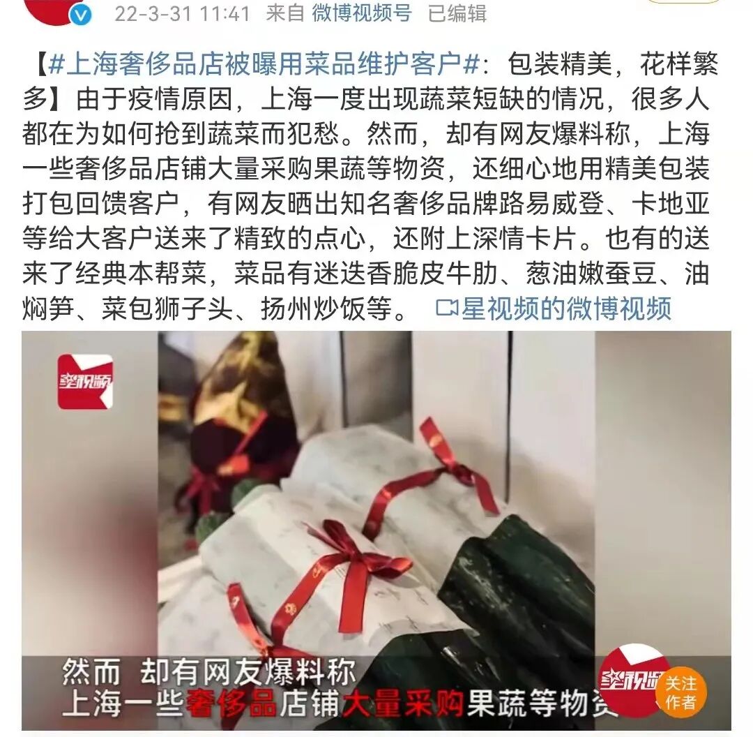 前两天,还有个这样的新闻上了热搜:上海奢侈品店被曝用菜品维护客户。