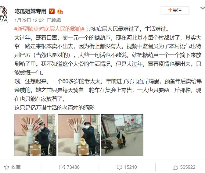 疫情刚开始那会儿,也是疫情最严重的时候,微博大V @吃瓜姐妹专用,发了一条微博,说河北农村一个卖糖葫芦的大爷,顶着风险也要出来卖糖葫芦。