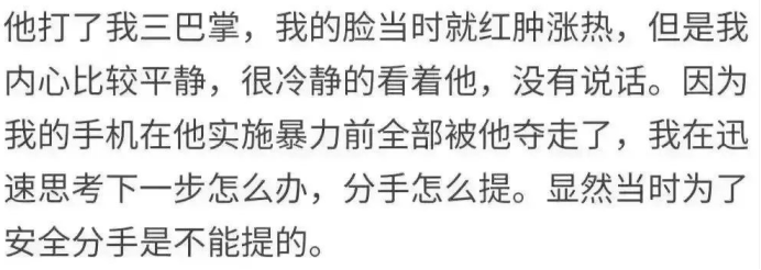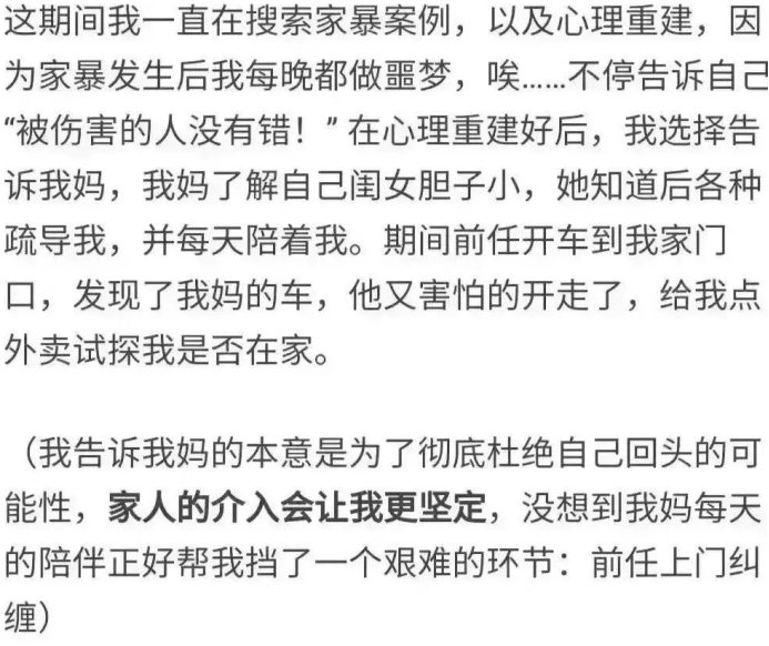 这期间,女孩一直在搜索家暴案例,给自己心理重建,甚至通过把事情告诉母亲的方式来彻底杜绝自己回头的可能性。
