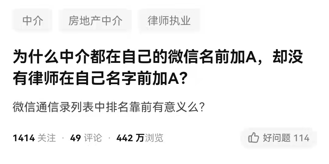 前几天在知乎上看到一个很有意思的话题:为什么中介都在自己的微信名前加A,却没有律师在自己名字前加A?