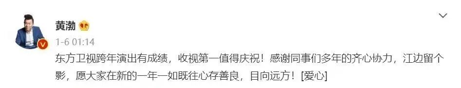 第一句,“东方卫视跨年演出有成绩,收视第一值得庆祝”交代了此行的目的,是去参加东方卫视跨年演出,这是公事。