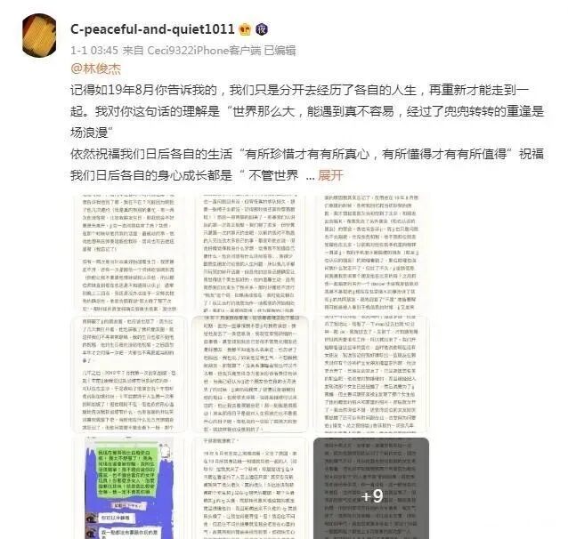 没过多久,一位自称“被林俊杰冷暴力”的女网友@C-peaceful-and-quiet1011也在微博上发了一篇大作文,洋洋洒洒写了好几张图片。