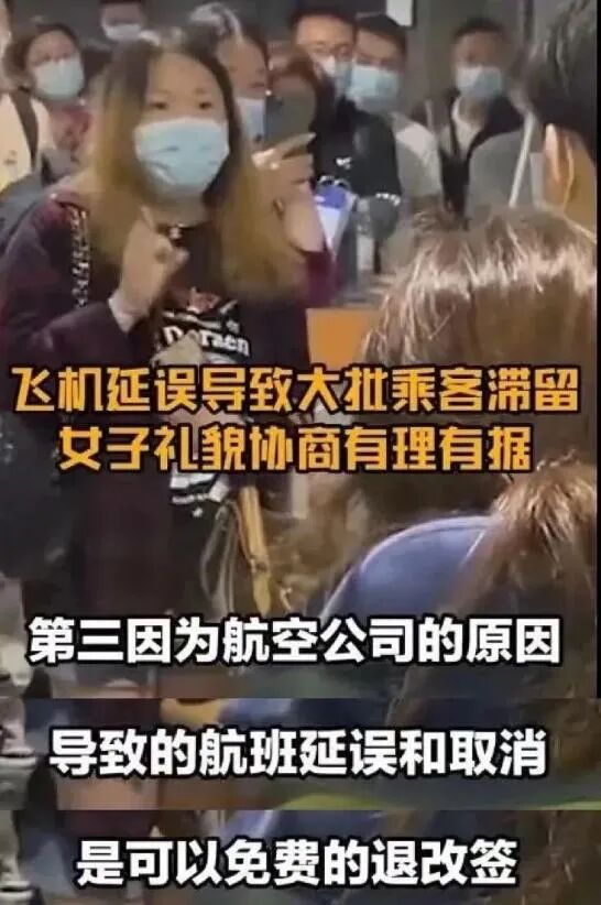 首先,她引用法律法规:按照民航的法律规定,因为航空公司的原因导致的航班延误和取消,可以免费地退改签,该有的经济补偿,也要给到大家。