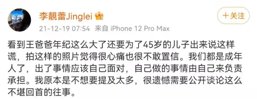 李靓蕾在微博上,更是直接指出王力宏懦弱,45岁的人,还要80多岁的老父亲出来解决问题。