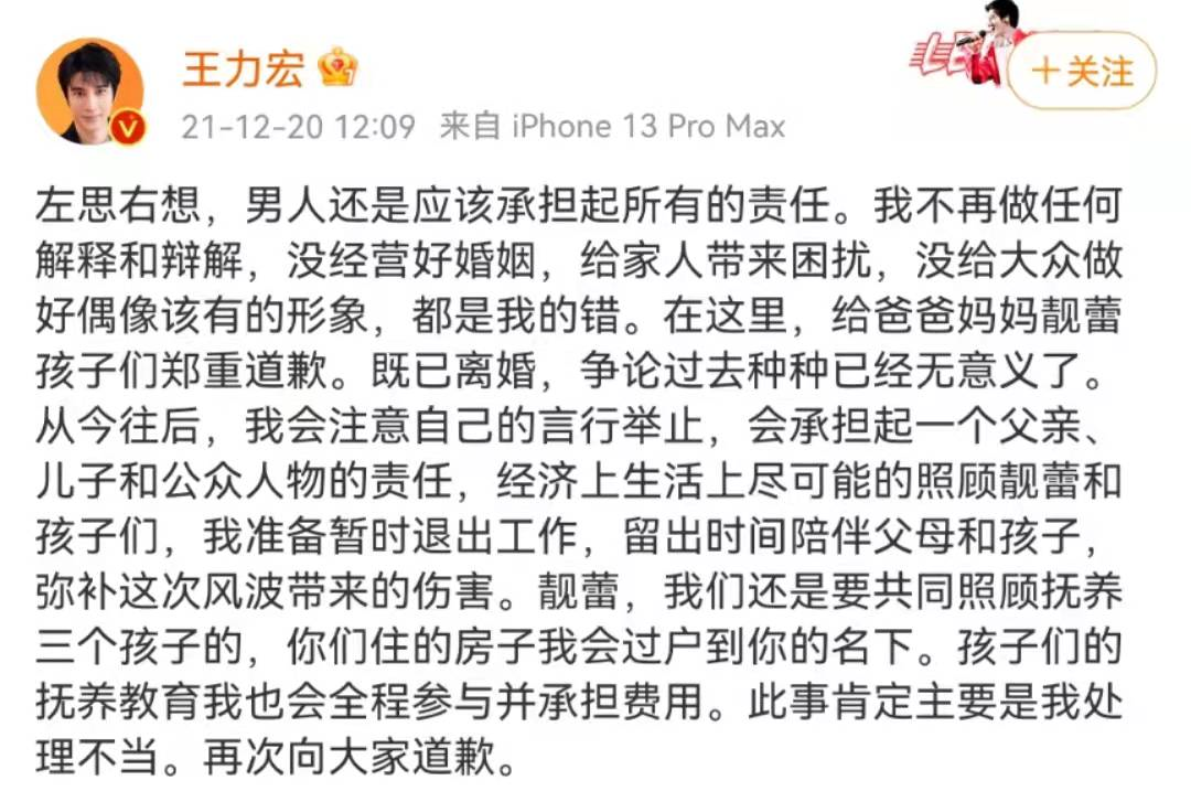 昨天,王力宏终于发微博道歉了。至此,他和李靓蕾的微博喊话也到此结束。