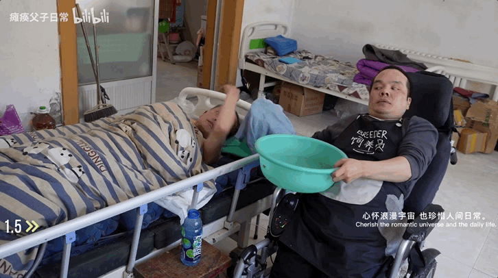 自己洗完脸,还要坐着轮椅,把搓好的毛巾送到躺在床上的父亲手上。