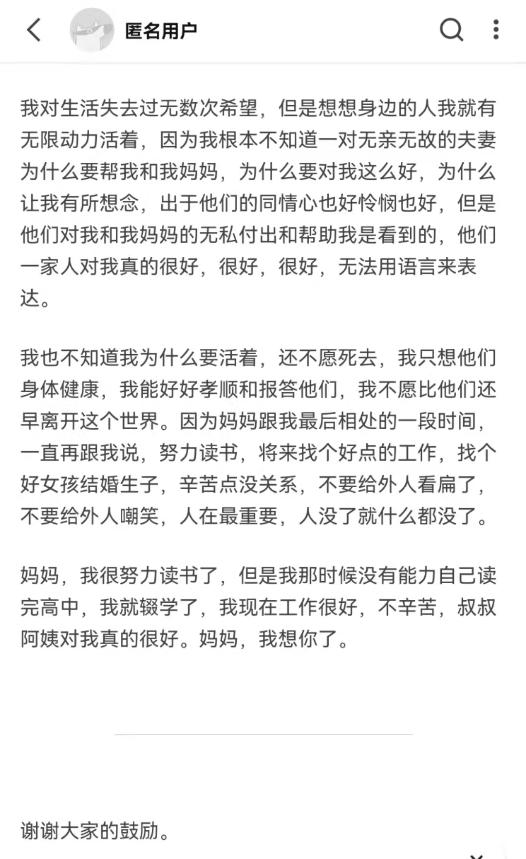 “我对生活失去过无数次希望,但是想想身边的人我就有无限动力活着,因为我根本不知道一对无亲无故的夫妻为什么要帮我和妈妈,为什么要对我这么好,为什么要让我有所念想……
