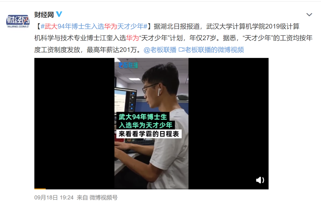 今年9月,湖北日报官微发布消息称,武汉大学计算机学院2019级计算机科学与技术专业博士江奎入选华为“天才少年”计划,年薪201万。