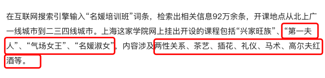 最近几年,北上广深等一线城市开设了不少名媛培训班,课程包括两性关系、品茶、插花、礼仪、马术、红酒品鉴课等。