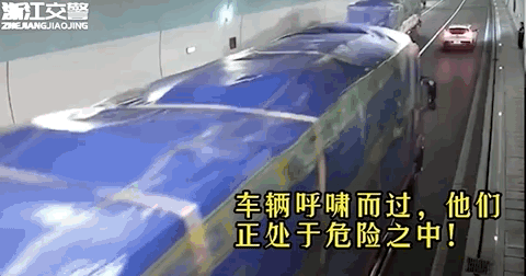 但两人并没有选择这样做,而是分别把车子停在了隧道内的一、三车道上,准备下车查看车损情况。