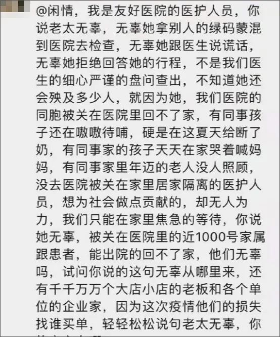有一位自称是接诊过南京老太医院的护士说,因为老太的违规行为,导致他们医院的同事回不了家,有同事家年迈的老人没人照顾;有同事的孩子天天在家呼喊着妈妈;有同事的孩子还在嗷嗷待哺,同事却硬是在这个夏天给断了奶……