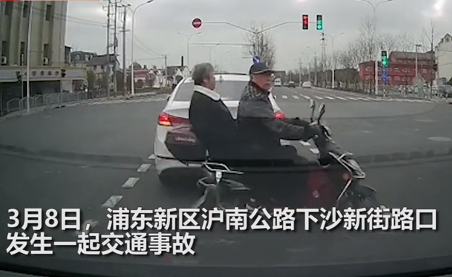 从视频画面看,骑电动车的两名老人均未戴头盔,不但闯红灯,还横穿马路。