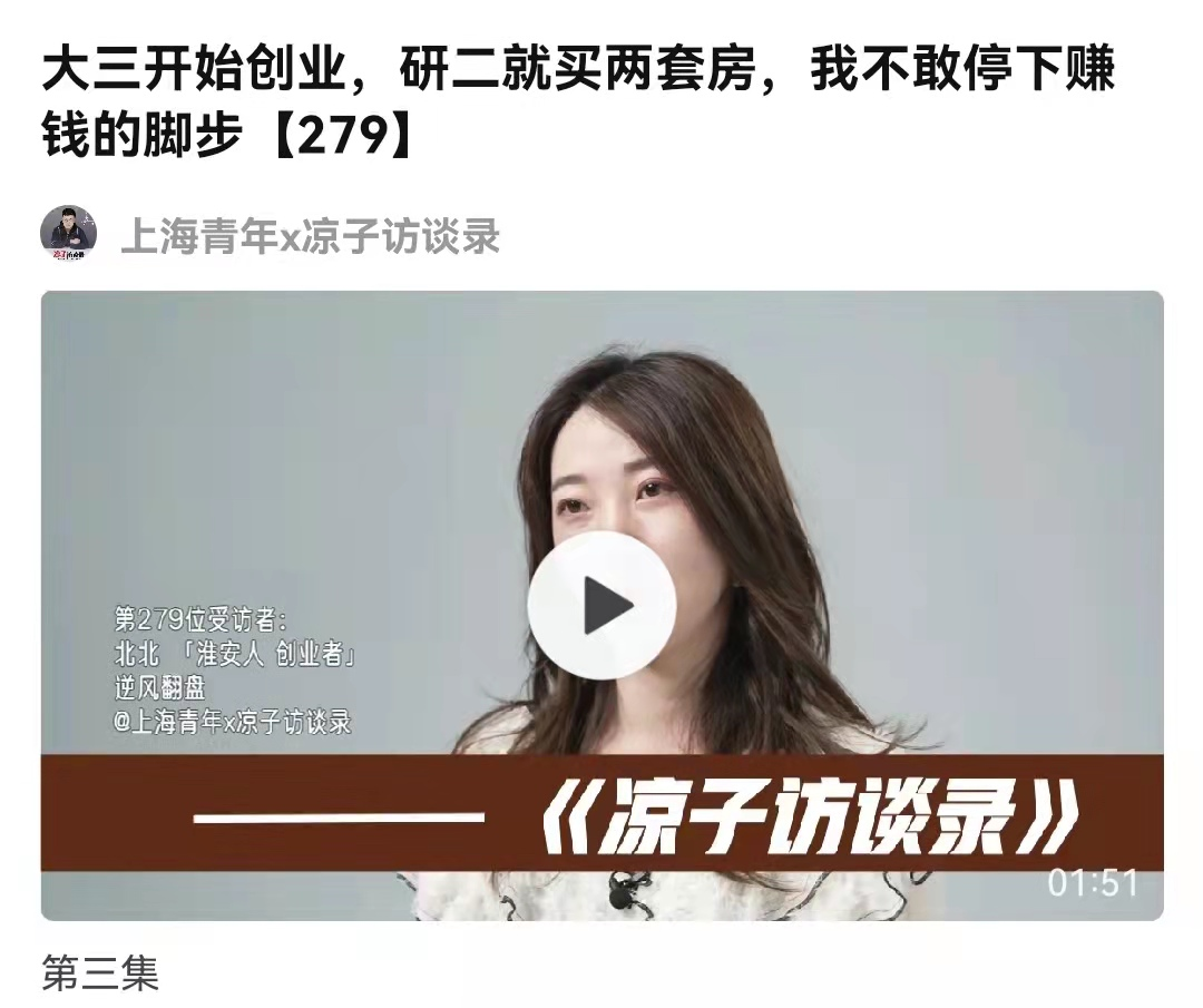 这是《凉子访谈录》里的一个视频标题,受访者北北是一位青年创业者。