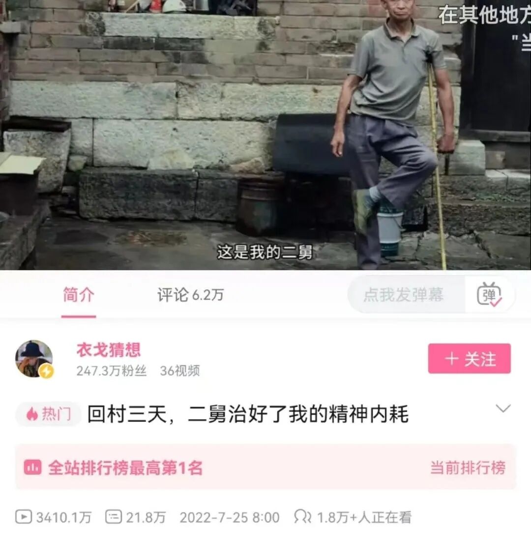 7月25日,B站UP主@衣戈猜想发布了一个名为《回村后三天,二舅治好了我的精神内耗》的视频。短短几天时间,就获得了超3000万的播放量。