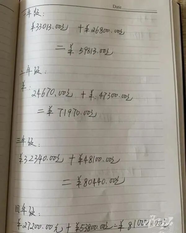几张手写的账单显示,从出生、幼儿园,一直到孩子毕业,花在孩子身上的养育费用,加起来有100多万。