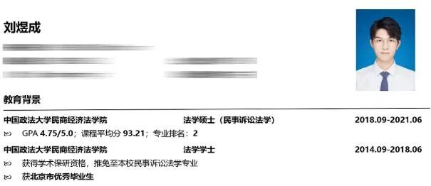 刘煜成毕业于中国政法大学,且专业成绩名列前茅,妥妥的名校学霸一枚,也是网友公认简历最牛最扎实的实习生。