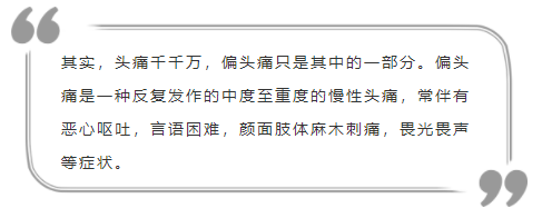 偏头痛是一种常见的原发性头痛,表现为头部一个区域的剧烈搏动性或跳动性疼痛,一般持续4~72小时,经常伴随恶心、呕吐,以及对光和声音敏感,日常活动可加重头痛,安静环境或休息可缓解头痛。
