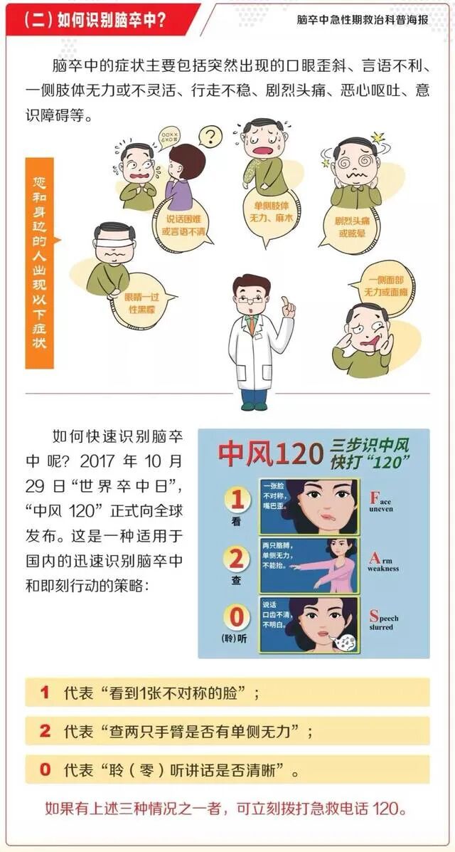 市民在日常生活中要时刻保持警惕,按照脑卒中“120” 口诀快速自查,其中任何一项异常均有力提示发生卒中。