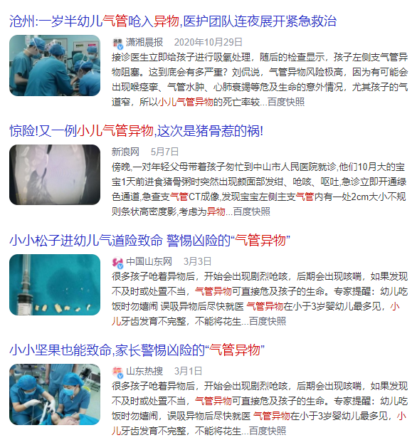 此外,家长如发现孩子进食后出现呛咳、憋气、面部发紫,要观察呼吸声是否变粗、喘鸣,高度警惕异物呛入气管。若没有明显征兆,但不久后出现持续性咳嗽、发热、脓痰等症状,也可能是气道有异物的体现,应立即送医治疗。